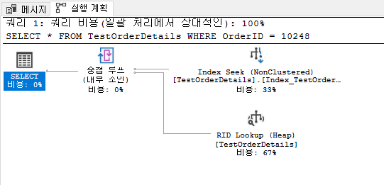 이렇게 실행 계획을 확인할 수 있게 된다. 우리가 확인할 부분은 바로 Index Seek다. Index Seek는 NonClustered Index 트리를 타고 원하는 인덱스로 바로 찾아가는 방식을 말한다. 뒤에 나올 Index Scan과 비교했을 때 일반적인 경우에서 훨씬 경제적으로 인덱스를 찾아준다. 1번 경우는 효과적으로 인덱스를 찾았다.