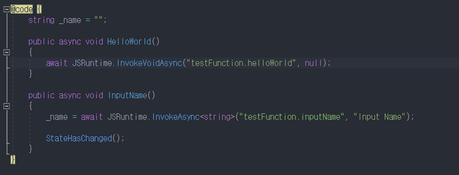 3️⃣ 사용하고자 하는 컴포넌트의 @code에서 기존에 만들었던 JavaScript 함수를 자유롭게 사용한다. 내가 test.js에서 만들었던 함수는 testFunction 안에 helloWorld와 inputName였다. helloWorld는 void형식이고 inputName은 string 타입의 Input Name이라는 변수를 받아서 작동되는 차이점이 있다.