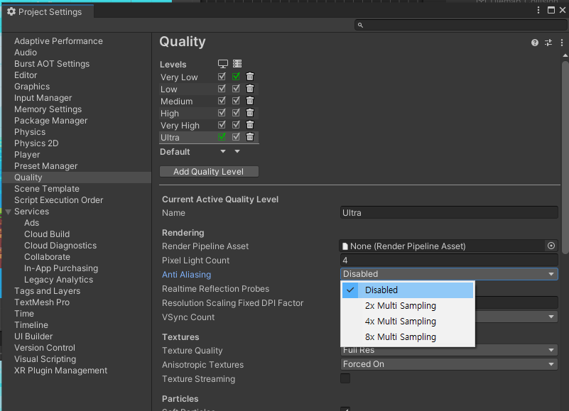 Quality -> Anti Aliasing을 Disabled로 변경해준다.