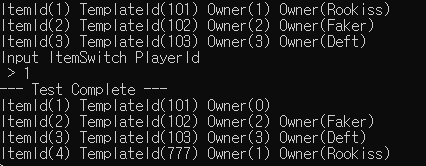 위 코드를 실행하면 Rookiss가 기존에 갖고 있던 아이템 101은 주인을 잃고, Rookiss는 777이라는 새로운 아이템을 얻게 된다. 만약 새로운 아이템을 추가하는 것이 아니라 기존에 갖고 있는 아이템의 이름만 변경하고 싶다면,