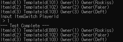 위 코드를 실행하면 Rookiss가 기존에 갖고 있던 아이템 101은 주인을 잃고, Rookiss는 777이라는 새로운 아이템을 얻게 된다. 만약 새로운 아이템을 추가하는 것이 아니라 기존에 갖고 있는 아이템의 이름만 변경하고 싶다면,