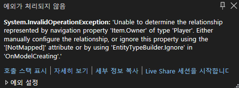 아이템을 생성한 Player와 아이템을 소유하고 있는 Player를 모두 나타내고 싶을 때는 어떤 방법을 사용해야 할까? 기존에 사용하던 Convention 방식을 사용하면 에러가 발생한다. (OwnerId와 CreatorId 두 개를 추가해주는 방식)