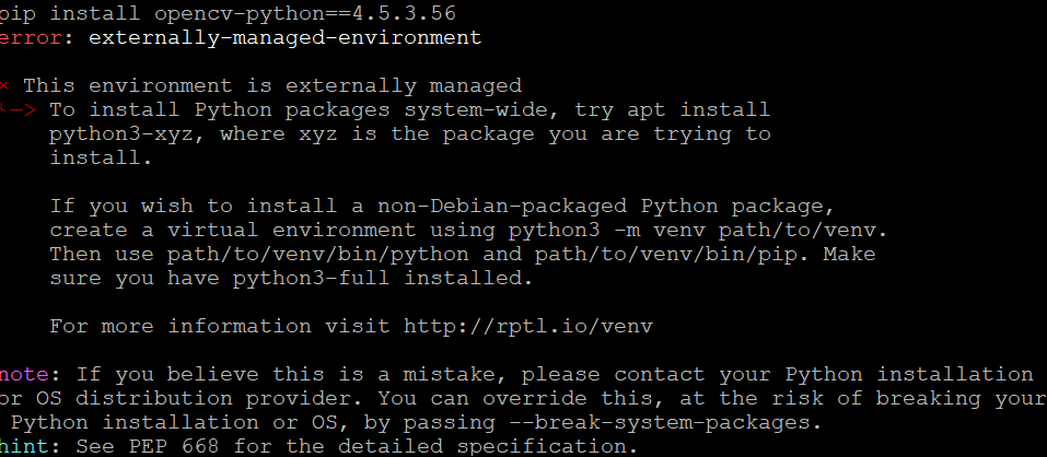 기본적으로 pip install –U numpy 명령어를 실행한 뒤 위 명령어 중 하나라도 정상적으로 입력되어 설치되는 것이 정상적이나... 라즈베리파이 5에 맞춰 라즈베리파이 OS가 업그레이드되면서 위 명령어가 정상적으로 작동하지 않는다(2023년 10월 이후, 나의 경우 Raspberry Pi Imager v1.8.1였다). 애초에 numpy부터 제대로 되지 않고 하다못해 upgrade, update도 제대로 되지 않는다.