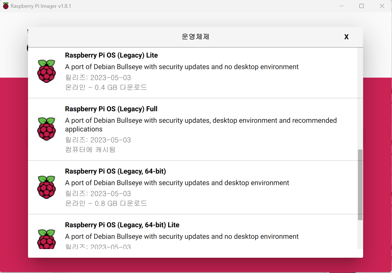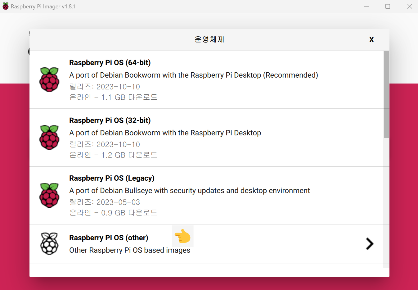 운영체제를 선택하면 해당 화면이 뜨는데 Raspberry Pi OS (other)를 눌러 다른 선택창을 만들어준다.