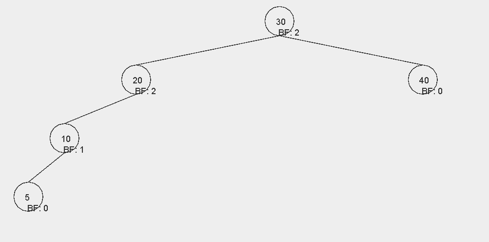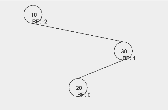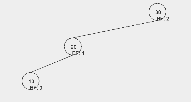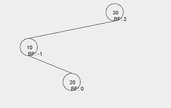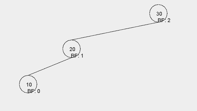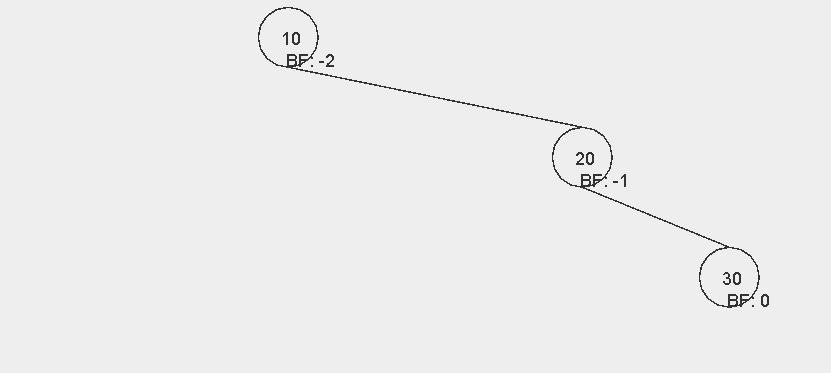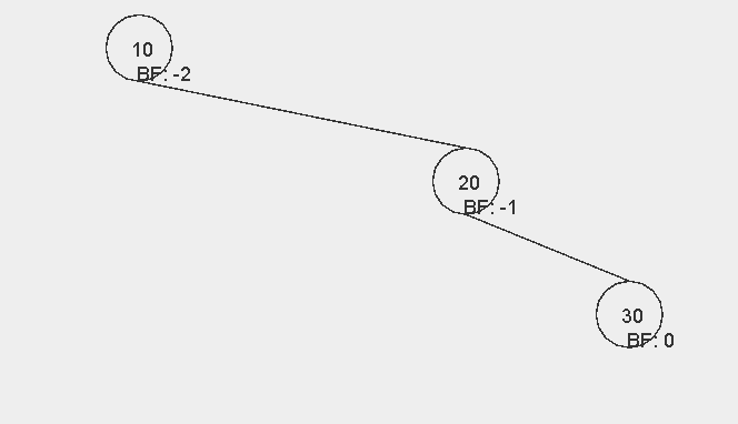 이때 그래프가 위와 같은 모양이 되면 노드 20과 30의 입장에서 BF 값이 2가 된다. 즉, AVL 트리가 깨지게 된다. 이 트리를