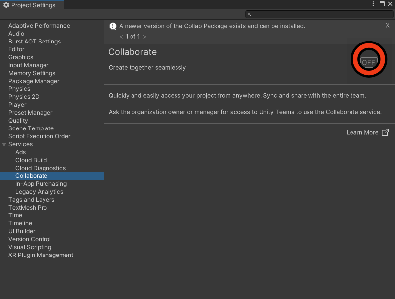 2️⃣ Edit -> Project Settings -> Services -> Collaborate -> OFF