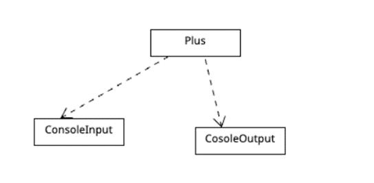 추상적인 상위 모듈인 Plus가 구체적인 하위 모듈 ConsoleInput과 ConsoleOutput에 의존하는 잘못된 상황을 보여주는 클래스와 클래스 다이어그램이다. 기존 코드 수정 없이 새로운 기능을 추가할 수도 없는 OCP 위반 상황이기도 하다.