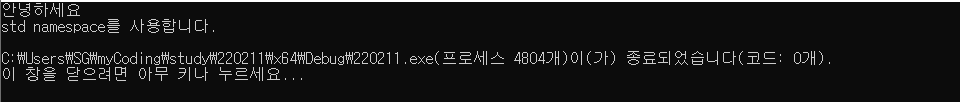 성공적으로 프로그램이 실행된다. using namespace std;를 선언하고 cout 앞에 또 std를 붙여도 잘 작동한다.