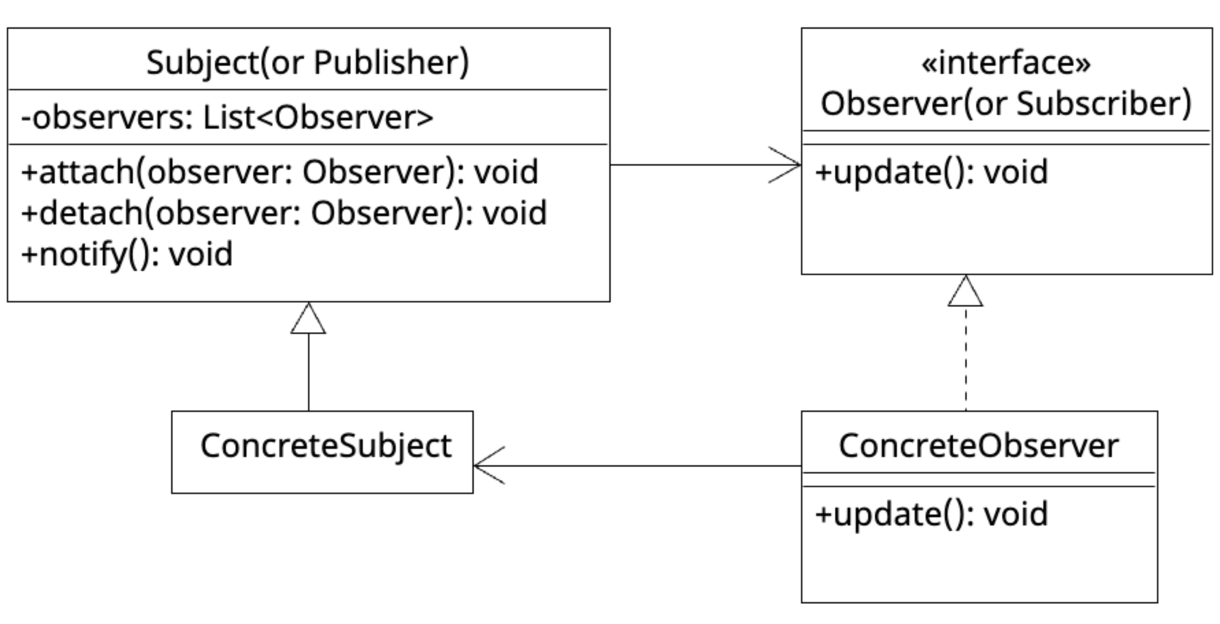 상태가 변할 수 있는 객체를 우리는 Subject라 한다. 예시 속 가게가 Subject이나 우리의 Subject는 손님에게 메시지를 전달하는 Publisher 역할도 맡는다. 손님은 ConcreteObserver가 되어 데이터 변경을 통보받게 된다.