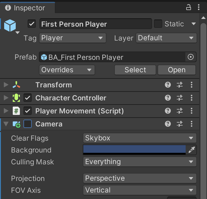 1인칭 프로젝트를 진행 중이기에 Player 하위에 Camera가 들어있고 이게 Main Camera 역할을 하고 있는 상황이다.