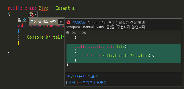 만약 Fly나 Swim을 구현해주지 않을 경우 아래의 오류가 나타나게 된다.