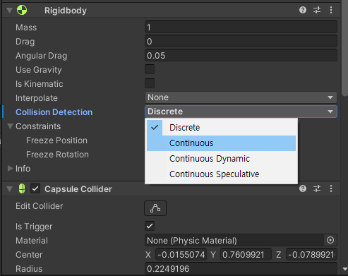 Player Rigidbody Collision Detection을 Continuous, 혹은 그 밑에 있는 Continuous Dynamic으로 변경해본다.
