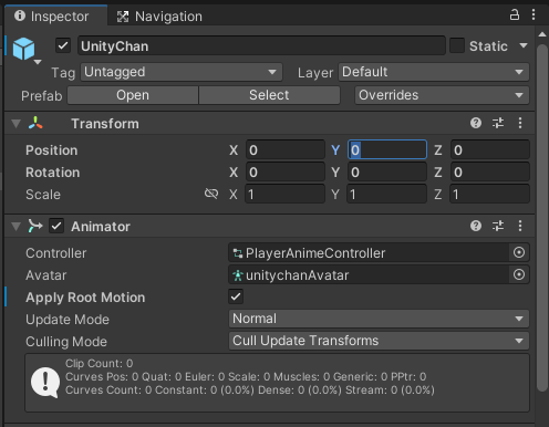 기본값인 0으로 설정되어있는 Player의 Transform Position Y를 변경해본다. 나는 2로 변경하고 새로 재생해봤지만 변화는 없었다.