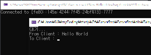뒤에 열린 클라이언트 창에서는 서버가 자신에게 어떤 정보를 보낼지 무한 대기하며 기다리게 된다. 물론 자신이 서버에게 보낸 Hello World는 정상적으로 출력된 상태다.