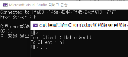 서버에서 hi라는 말을 전달하면 클라이언트에서 정상적으로 hi를 받고 출력한다. 이렇게 아주아주 간단한 소켓 클라이언트가 완성됐다.